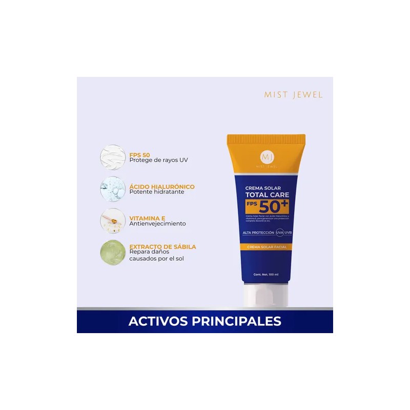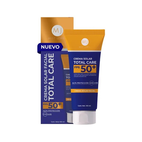 Disfruta del sol sin preocupaciones con el protector solar facial Mist Jewel Total Care FPS 50+. ☀️ Su fórmula avanzada con ácido hialurónico no solo crea una barrera invisible contra los dañinos rayos UV, sino que también proporciona una hidratación intensa y duradera. Resistente al agua, libre de aceite, gluten y crueldad animal, este protector solar hipoalergénico es perfecto para toda la familia, incluyendo niños mayores de 3 años. ¡Tu aliado diario para una piel protegida y saludable! 💖