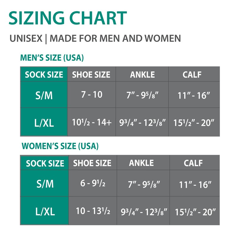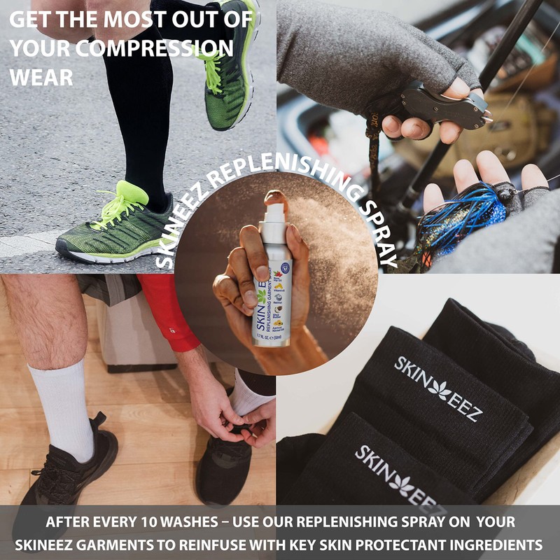 - MADE IN THE USA our compression socks are made to last when paired with Skineez Garment Replenishing Spray (sold separately). After 10 washes, or as needed, spray Garment Replenishing Spray inside the garment to restore benefits and extend the life of a Skineez garment. 91% Nylon/ 9% Spandex. For Men’s Shoe Size 10.5-14. For Women’s Shoe Size 10-13.5. For Men and Women with Calf Size and Calf Size 15.5-20 inches. Size Large/X-Large. 1 Pair (Pack of 1)