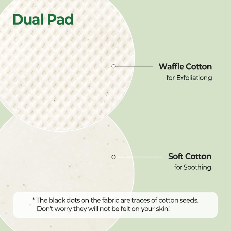 - 🌿 Soft Fabric Double Sided Pad : Thick and textured soft pads tidy up excess sebum and skin impurities. Super soft double-sided pad made with natural fabric provides different properties from each site. The soft smooth side helps moisturizing and hydrating while embossed side helps exfoliating in areas such as the nose and chin. The black dots on our fabric toner pads are natural traces of cotton seeds which doesn't harm you.