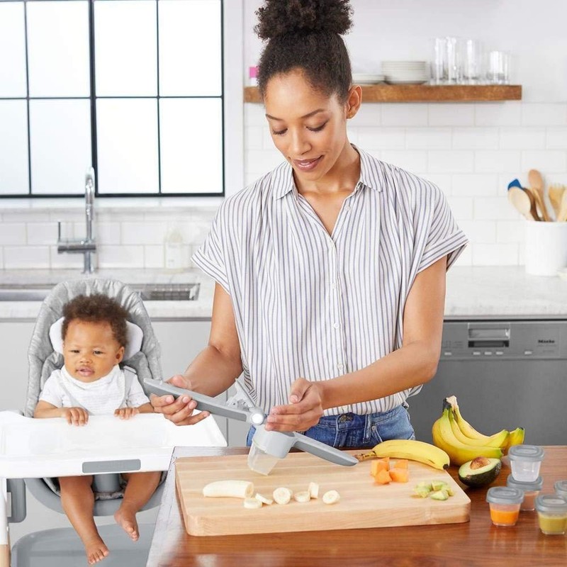 - Easy 3-step system: slide container into press, fill with soft food, squeeze handles to press