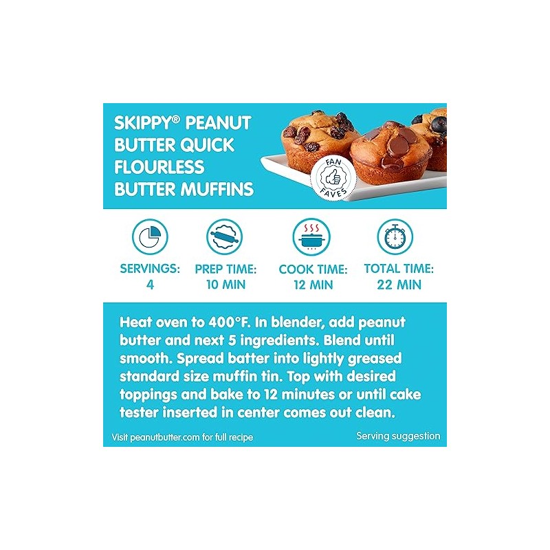 SKIPPY Peanut Butter has been spreading tasty fun to every household since 1933. With 4 simple ingredients, 7 grams of protein, and no artificial flavors or colors, this creamy peanut butter 1 pack of 40 Ounce is perfect for any snack or part of any meal. From a delicious piece of peanut butter toast, to apples or celery with a peanut buttery dip, the different ways to enjoy SKIPPY are endless. So when you're craving an easy, satisfying snack, there's only one thing to do. Be Smooth Like SKIPPY.