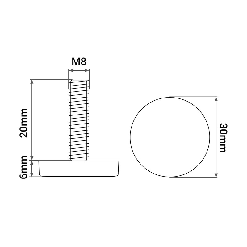 - Height: 26 mm. Black part diameter: 30 mm. Solid construction. M8 threaded stem.