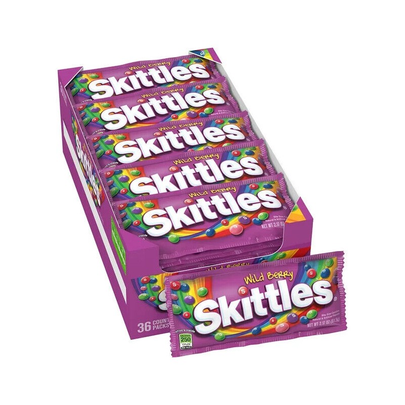 "Satisfy your sweet tooth with Wild Berry Skittles Bite Size Candy! This pack contains 36 convenient 2.17oz bags, each bursting with the juicy flavors of wild berries. From luscious strawberry to tart blackberry, every Skittle offers a delightful burst of fruity goodness. Perfect for sharing with friends, stocking up for movie nights, or adding a pop of color to your candy bowl. Indulge in the irresistible flavors of Wild Berry Skittles and treat your taste buds to a berrylicious adventure."