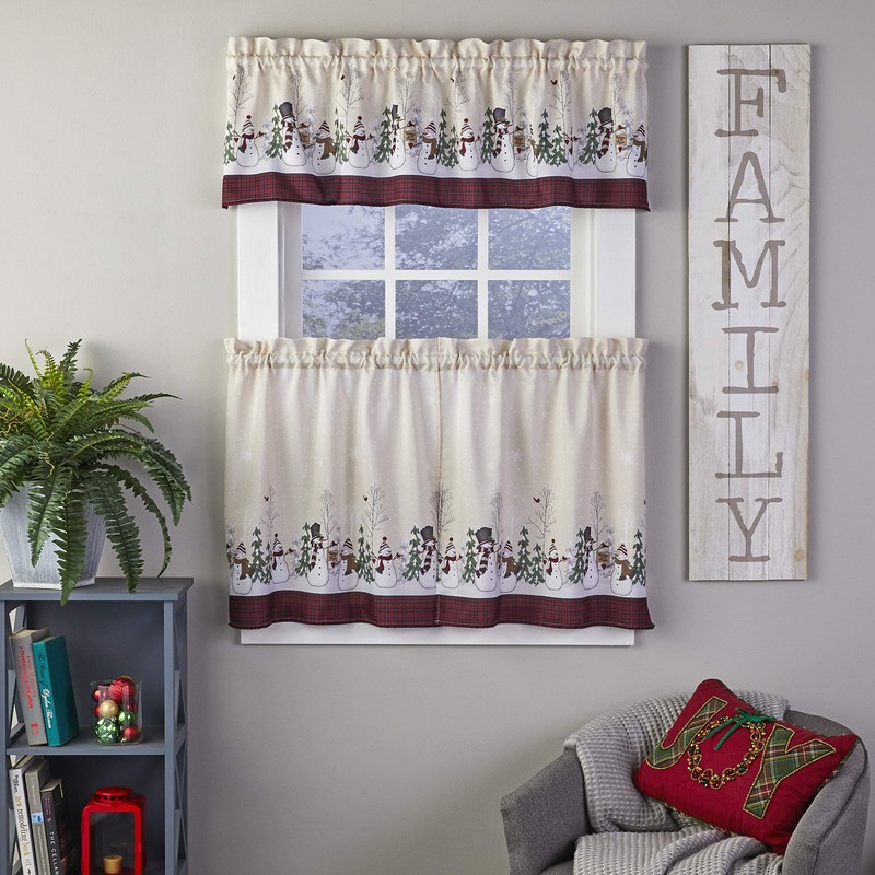 - Lightweight woven with a snowman motif and plaid border; 1.5" diameter rod pocket