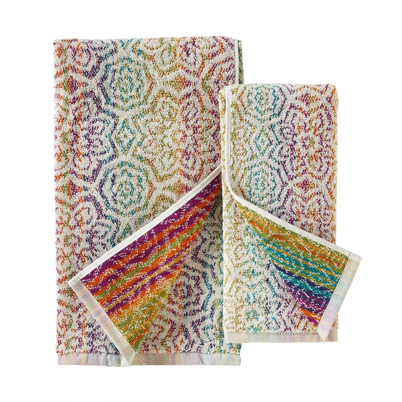 • Soft and absorbent terry jacquard with a multicolor, striped medallion pattern