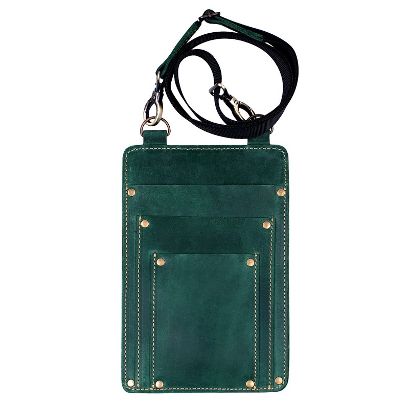 - Leather tool organizer has 3 pockets that are reinforced with rivets. Belt length allows to wear this tool holder on the waist or crossbody.