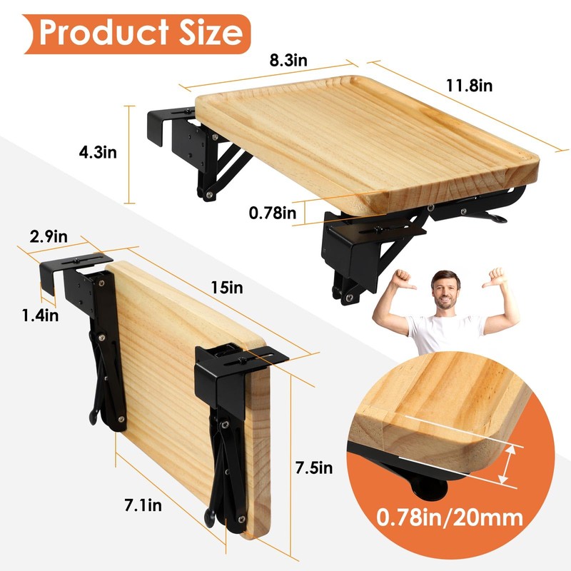 The SKMYL Bunk Bed Tray is the ultimate space saving solution for dorm bunk beds. We conducted in-depth research on different scenarios and different groups of people, collected various suggestions, and formulated various plans. After a year of design and testing, we finally designed this foldable shelf. This tray adopts a foldable design, using stainless steel as a folding support frame; the bedside clamp can adjust the width, and the adjustment range is 0.6 inches to 1.78 inches, which is suitable for beds of different widths; the tray is made of wood, and its size: length 11.8 inches, width 8.3 inches, 0.78 inches thick, can support heavy objects; the design of the whole product is simple and retro, it is a good choice for your bedside shelf. The multipurpose shelf clips easily to your bed frame to provide convenient, secure storage for your belongings. Whether you need a place for your phone, a mug for late-night drinks, or a surface for books and laptops, this bunk bed tray has it all. Make the most of your dorm room with the SKMYL Bunk Bed Tray.