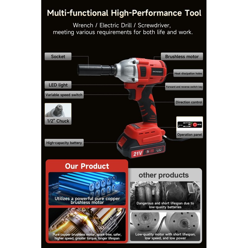 SKOVENSY Cordless Impact Wrench, 1/2 Impact Gun, 2 Batteries, Pistola de Impacto, with 5 Sockets, Electric Impact Driver for Car Tires and Home RED3