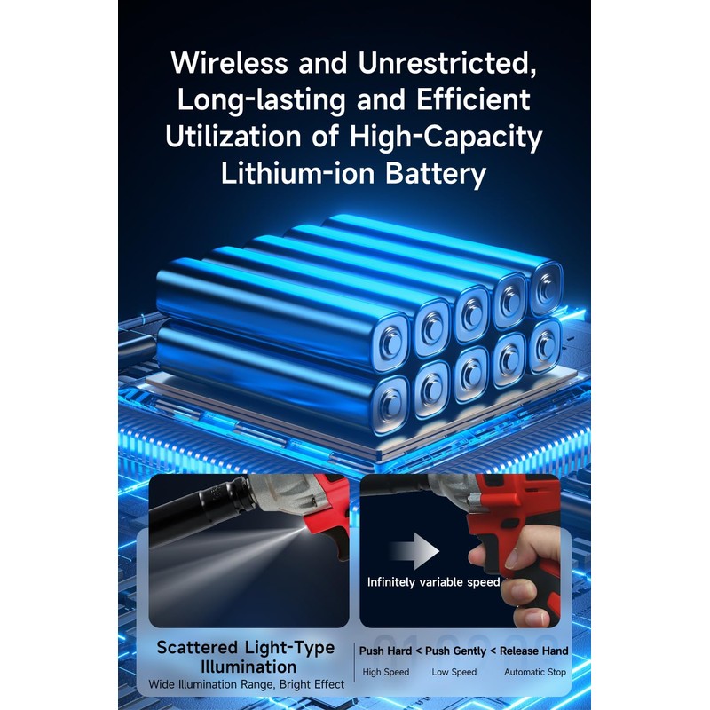 - 【High-Capacity Battery & Built-in LED Lamp】This Cordless Impact Wrench comes with high-capacity lithium batteries, ensuring long hours of operation in outdoor or power-limited environments. With two included batteries, downtime for recharging is minimized, improving efficiency. The Cordless Impact Wrench also features a built-in LED light that activates when the trigger is pulled, providing smooth operation in any lighting condition.