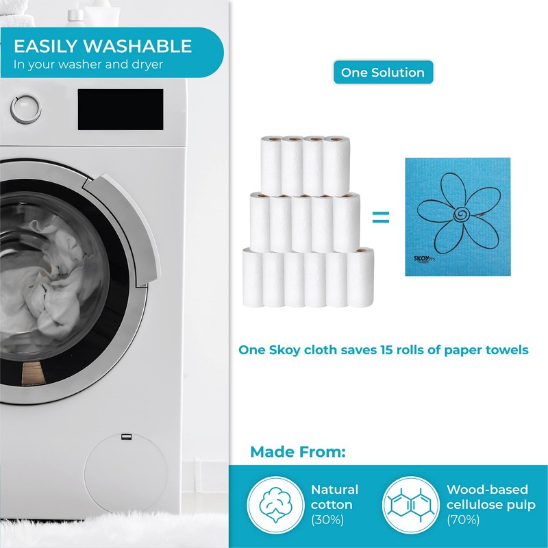 - Sustainable Choice: Using a Skoy Cloth is equivalent to using 15 rolls of paper towels. With the high cost of paper towels, the Skoy Cloth is the obvious choice for your wallet and the environment