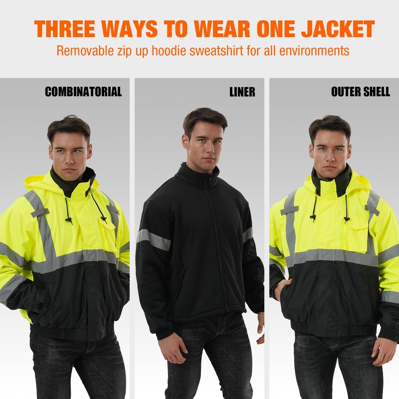 - COMFORT & WATERPROOF- This 3 in 1 reflective jackets for men are made of a polyurethane-coated 100% polyester shell. Fleece inner lining, elastic waistband, and wrist cuffs help improve both the fit and comfort of the jacket while providing the warmth needed for winter work.