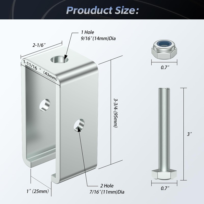 - 【Support Hanger Size】1-5/8 Inch Depth x 3-3/4 Inch Height. The diameter of the top hole is 9/16 Inches, hole on the sides is 7/16 inches.