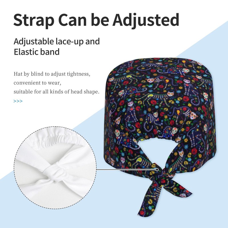 Skull Cat Working Cap with Sweatband for Women Men, Adjustable Cleaning Working Hats, Nurse Surgical Caps(Tie Back)