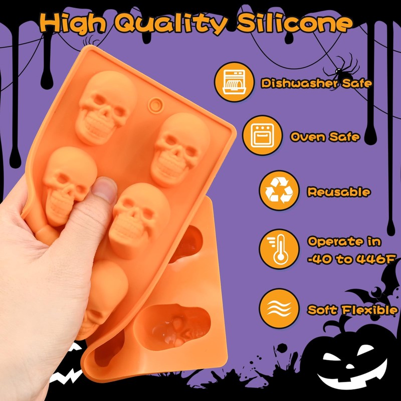- High Quality Silicone Molds: This Halloween skull chocolate mold is made of food-grade silicone, safe and durable. Resistance range of the skull mold is from -40°F to 446°F. It can be safely used in microwave ovens, ovens, refrigerators and dishwashers