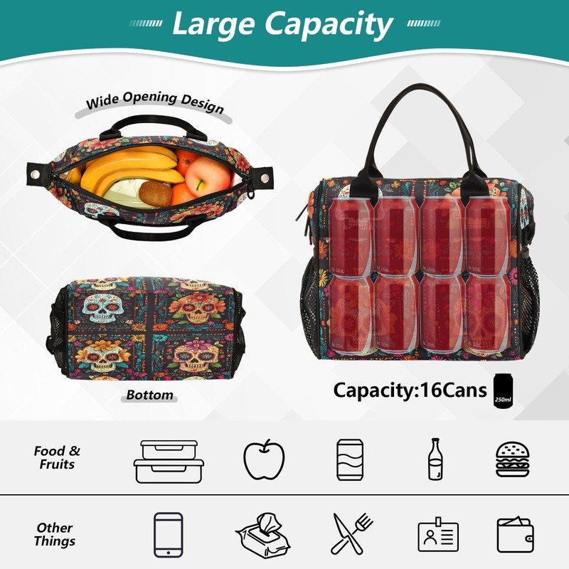 Skull Day Of The Dead Square Lunch Bag for Women, Insulated Lunch Box for Students, Women's Lunch Tote Bag with Side Pockets & Removable Shoulder Strap Large Cooler Purse for Picnic Work Beach
