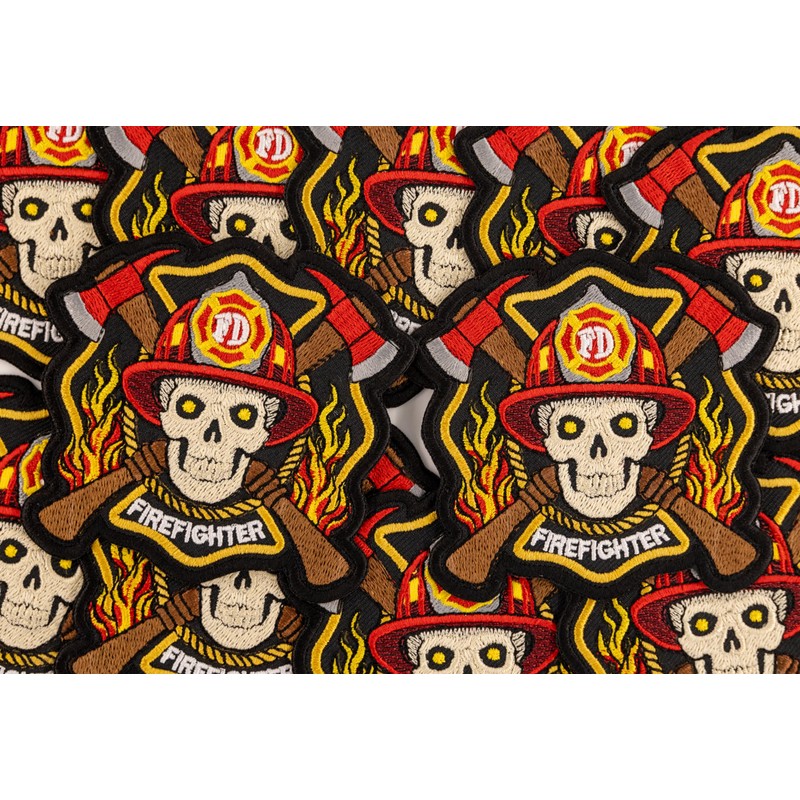 Skull in a Fireman's Helmet Against a Background of fire and Crossed Axes. Embroidered Patch Iron On. Size 3.5 x 3.7 inches.