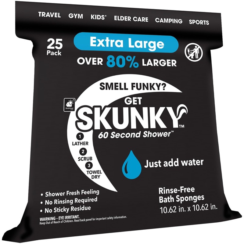 - Smell funky? Get Skunky! These XL rinse-free bathing wipes help get you clean in 60 seconds without stepping into a shower — ideal for gym, camping, travel, kids, elder care, sports, & more.