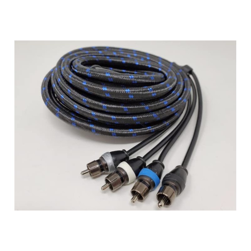 Features: - Sky High Car Audio 4-Channel Triple Shielded RCA - 18ft - Oversized OFC conductors - Nylon woven outer coating (blue/black) - PVC coating inside the nylon coating the conductors. - Mylar Foil Shield for increased noise reduction. - Twisted Pair windings - Woven nylon material within the cord prevents tangling and adds flexibility while enhancing the cables internal performance and strength. - Molded connectors with color coated labels (blue/black) - Split tip ends