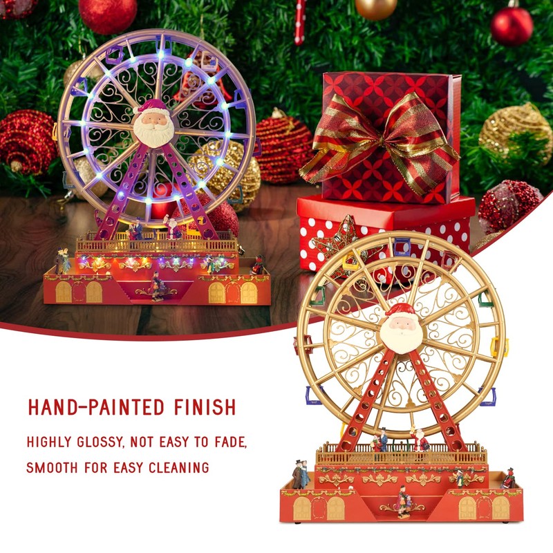 - Hand Crafted——This animated musical ferris wheel is carefully hand-made by skilled craftsmen.The big golden Ferris wheel has 12 seats on the pillars. It turns with the music, and the pillars have LED lights that emit colorful light. In the middle of the Ferris wheel is the head of Santa Claus with a funny expression. There are many people standing under the Ferris wheel, and the appearance of people coming and going is very realistic to simulate the Christmas scene, natural and real.