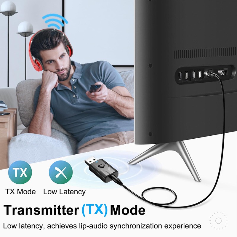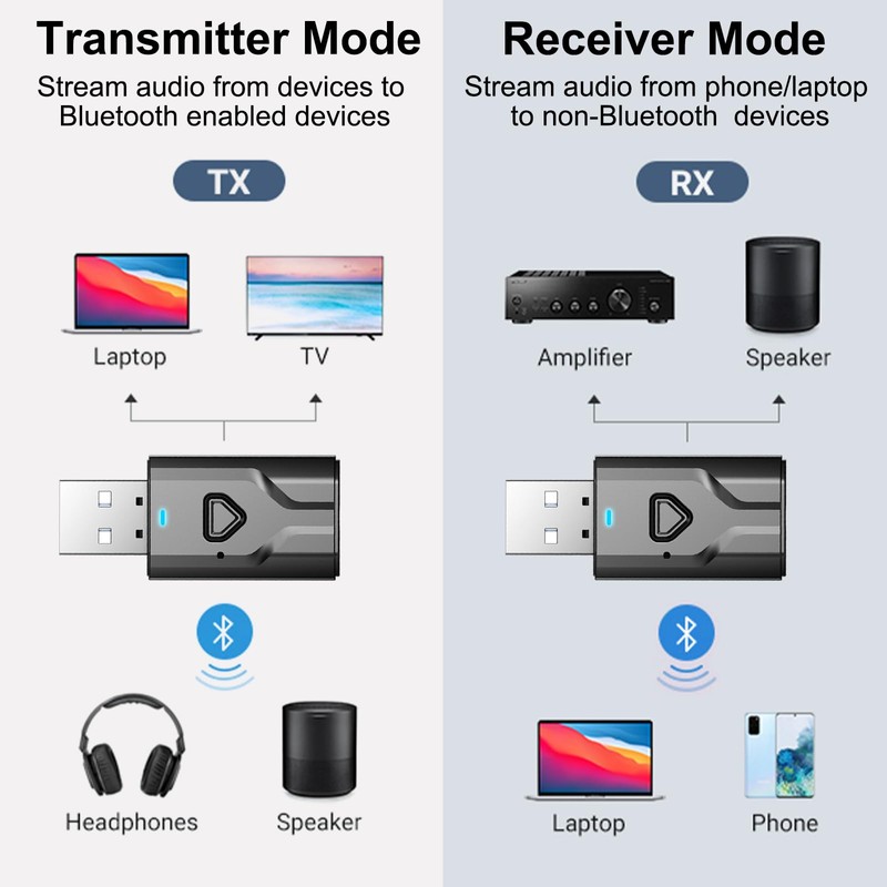 - -- TRANSMITTER MODE : Connect with non-Bluetooth devices(e.g. TV, projector, MP3 player, etc) via 3.5mm aux cable, and pair with Bluetooth speaker or Bluetooth earphones, then you'll enjoy wireless streaming.