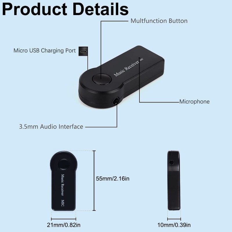 • 【PORTABLE AND EASY TO CARRY】: With super mini size, you could carry it everywhere without occupying any space. [ Package List: Bluetooth Receiver, USB Charging Cable, 3.5mm AUX Adapter, User Manual. ]