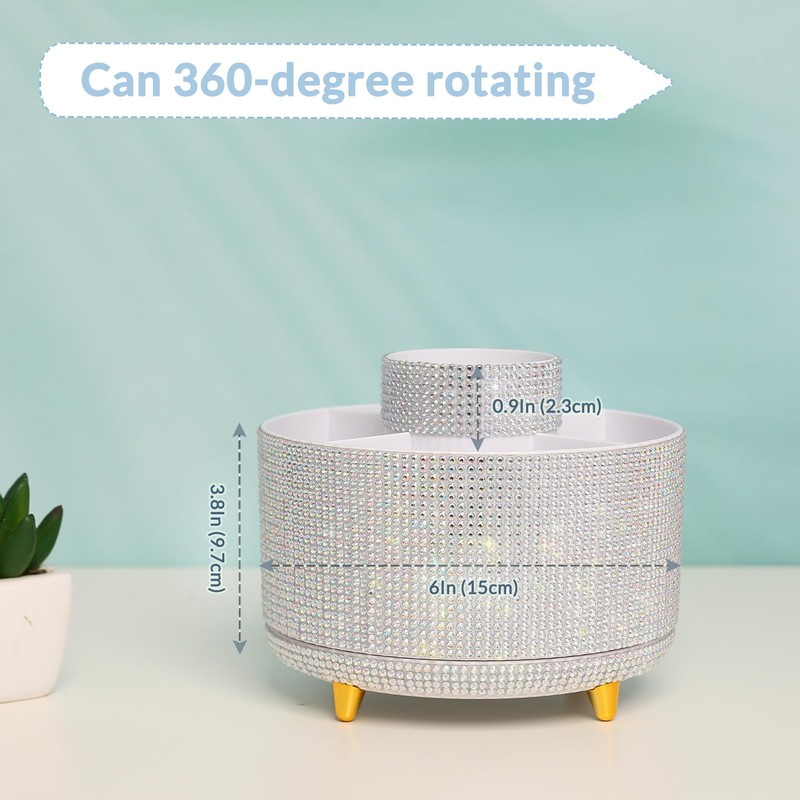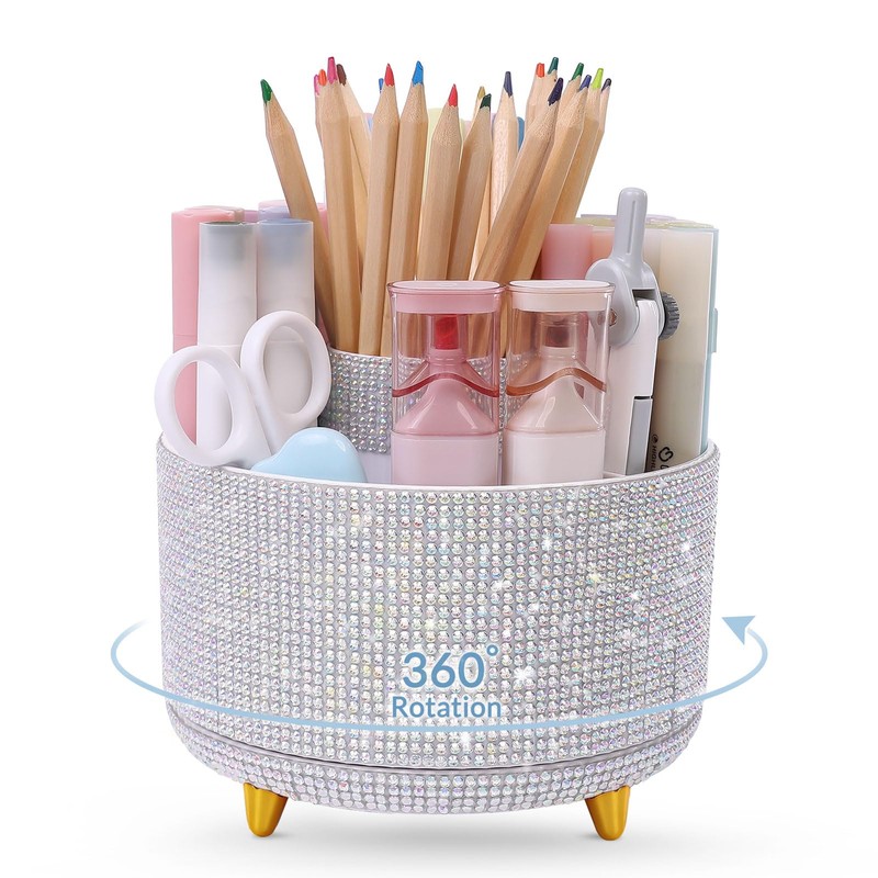 SKYDUE 360 Degree Rotating Desk Organizer, Shining Dual-Purpose Rhinestone Pencil Pen Holder, Rotating Desk Pen Organizer with 5 Slots, Rhinestone Pencil Cup for Office, School, Home