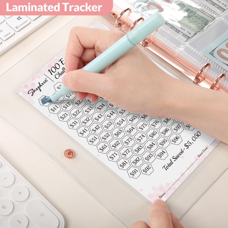 - Reusable Laminated Tracking Sheet: Laminated tracking sheet that can be reused, providing a sustainable and practical solution for your money saving challenge needs.The budget binder is crafted from robust, waterproof, and tear-resistant PVC material, ensuring durability and protection for your money.