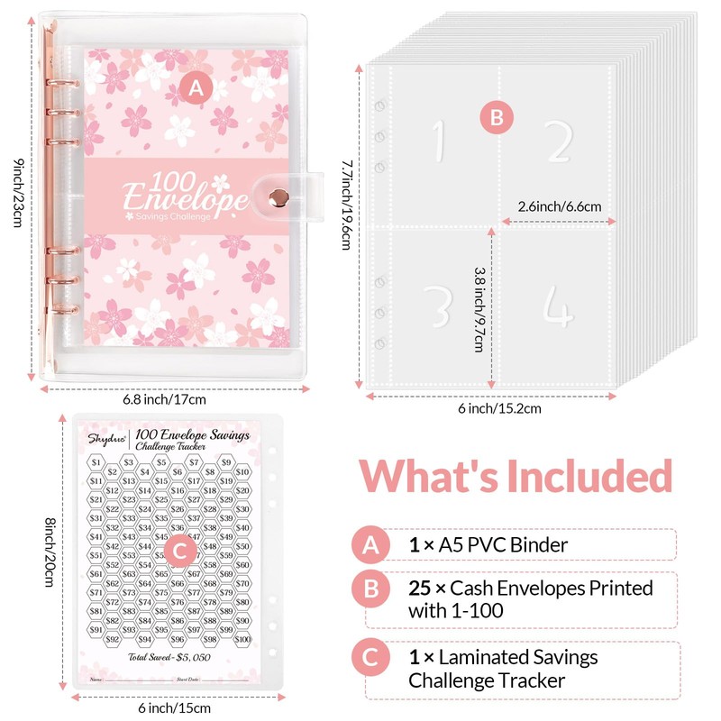 - 100 Envelope Challenge Binder Kit:A5 PVC savings binder with save $5050 sheet tracker of $1 to $100 laminated and pre-printed 100 cash envelopes labeled from 1 to 100,which is designed to help users save money effectively.