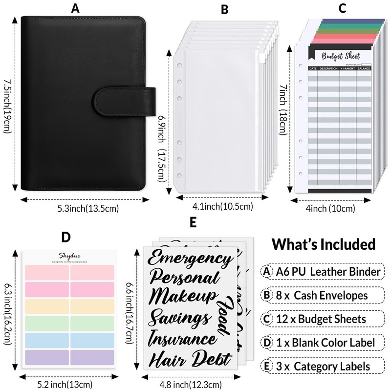 - Cash Envelopes System:1pcs PU leather money saving binder,8pcs A6 6-holes binder pockets,12pcs expense budget sheets,3 sheets of category sticker labels,Budget binder with cash envelopes perfect for you to save money.
