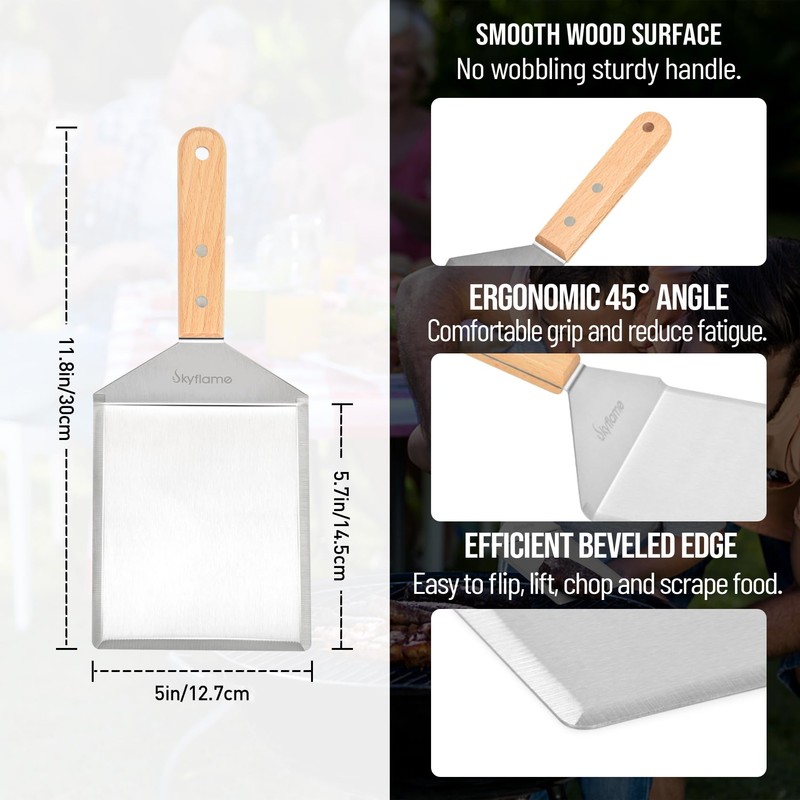 - Professional Smash Burger Spatula: Comfortable and heat-resistance wooden handle with hole for easy hanging. The ergonomic design provide excellent control and maneuver ability for precise flipping. Stainless steel beveled edges make it easy for scraping and cleaning extra food debris off your griddle.