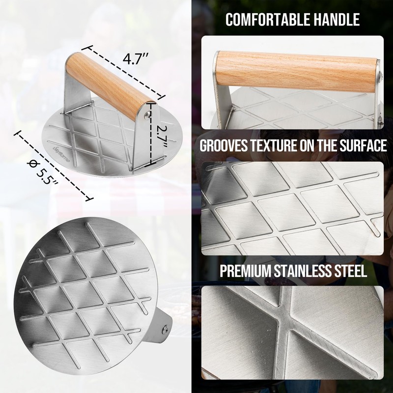 - Get Delicious Hamburger: The 5.5-inch diameter burger smasher for griddle, allows it to smash the entire patty effortlessly, make the heat more evenly distributed in the whole piece of meat. The edge locks in juices when pressing down to create crispy, cracked edges and a juicy center, resulting in a thinner, crisper burger.