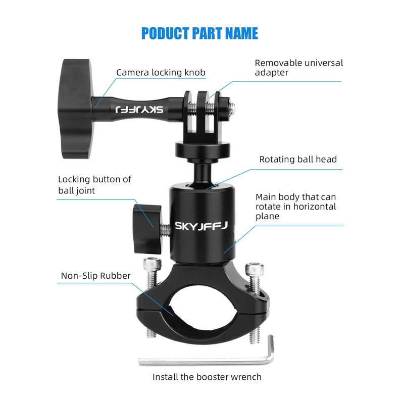 - 【MORE DURABLE QUALITY】:It is made of high rigidity aluminum alloy. Make it more durable than plastic one. No more worry about your action camera will dropping or falling down during high-speed movement. On the inside of the clamp have anti-skid pad. Waterproof, Rustproof and anti-corrosion.