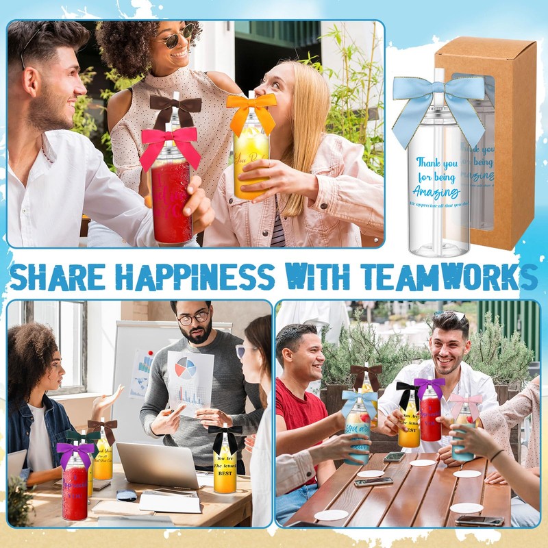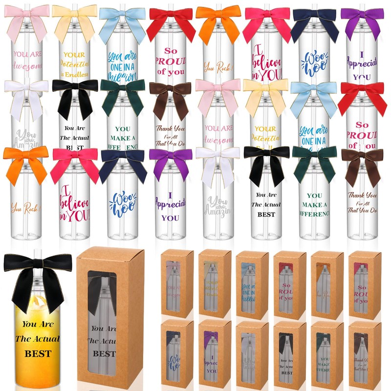 - Employee Appreciation Gift Set: this set includes 24 plastic cups that come with straws and lids; Imprinted with 12 different inspiring messages, these cups are offered in varying colors; Moreover, you can get 24 matching bows and 24 kraft paper cup boxes