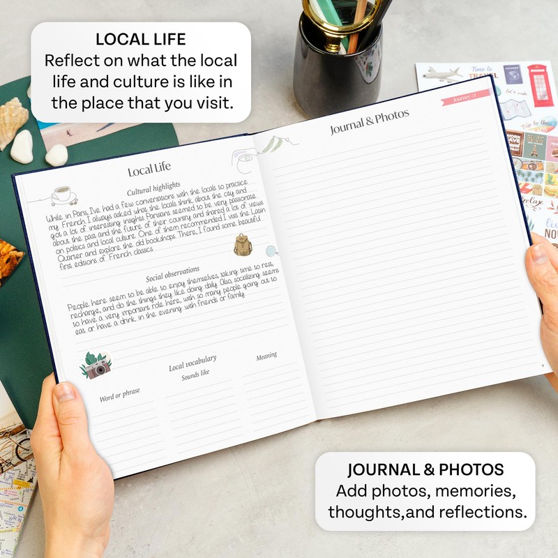 - ADD PHOTOS & RECORD TRIP HIGHLIGHTS – This large journaling notebook covers 17 trips with space for photos, stand-out experiences, cultural highlights, social observations, local vocabulary, travel diary journal entries, and more.