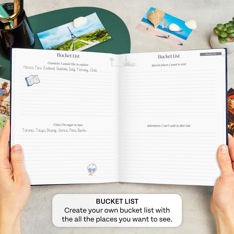 - BUILD YOUR PERSONAL TRAVEL BUCKET LIST – The traveling notebook journal has a dedicated bucket list to add all the travel favorites, countries, cities, places, and adventures you want to experience and cross them out as you go.
