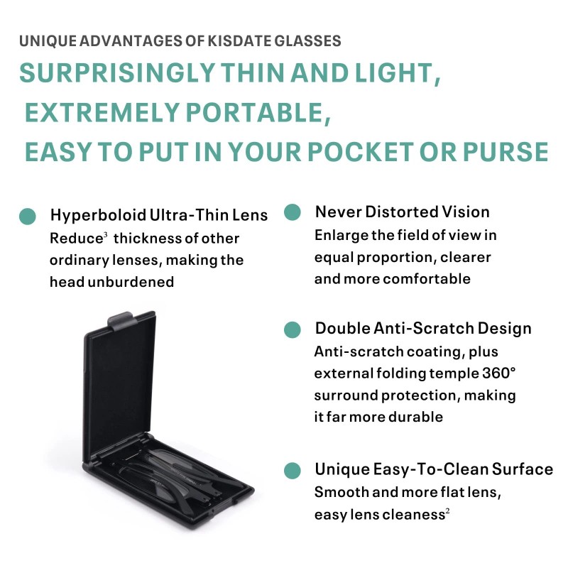 Abundant Accessories: 1 thin and hard glasses case with a soft protective film inside, preventing scratching the lens; 1 strong double-sided tape, which can stick the case onto your phone or any other flat surface; 2 soft rubber rings can be put on the temples of the glasses to prevent the glasses from sliding when worn; 1 eye manual; 1 cleaning cloth