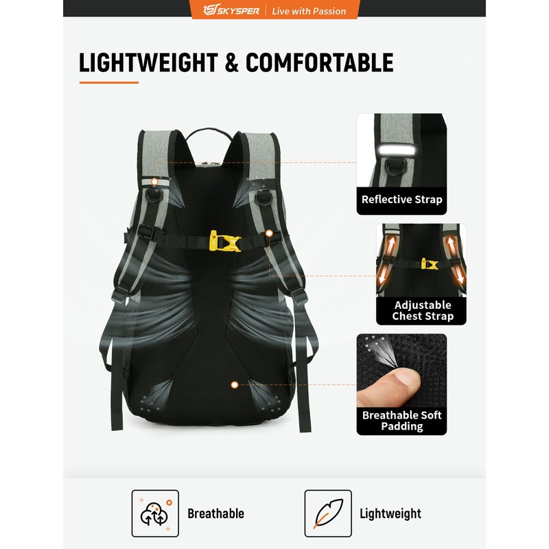 SKYSPER Hiking Backpack 30L Lightweight Travel Backpack Hiking Day Pack for Men Women(Grey)