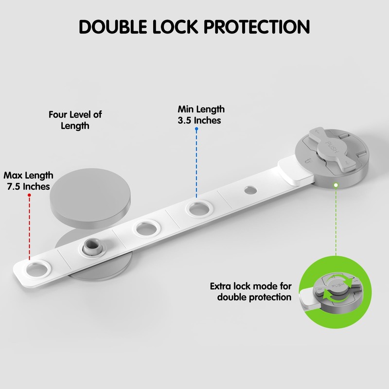 - [Adjustable and Protective] To accommodate various applications, the strap of this child-proof lock is adjustable in length from 3.5 inches to 7.5 inches. The strap is made from soft PE material, which offers better protection for children's delicate hands compared to hard plastic straps in other products.