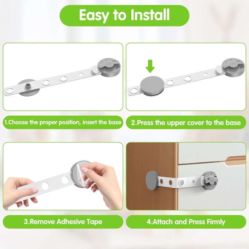 - [Easy to Install] The cabinet locks for babies comes with adhesive tape, making installation easy. Simply peel off the adhesive film and stick the lock onto a clean surface of the door, no drilling or tools required. It can be removed easily using a hairdryer or dental floss without damaging your furniture. Each package includes 8 extra adhesive tapes at no additional cost, allowing you to reuse the latch as needed, saving money!