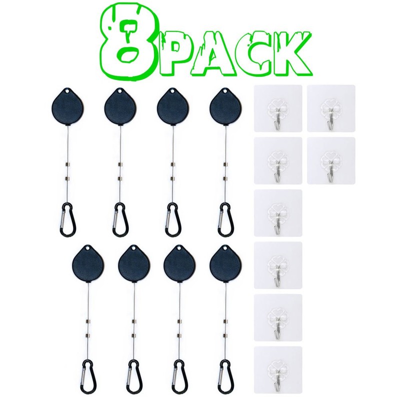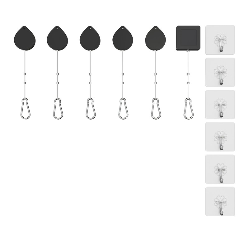 Package Includes Everything you need and more. 6 x Adjustable Retractable lines with tools, 6 x Adhesive Hooks and 6 x Carabiners: