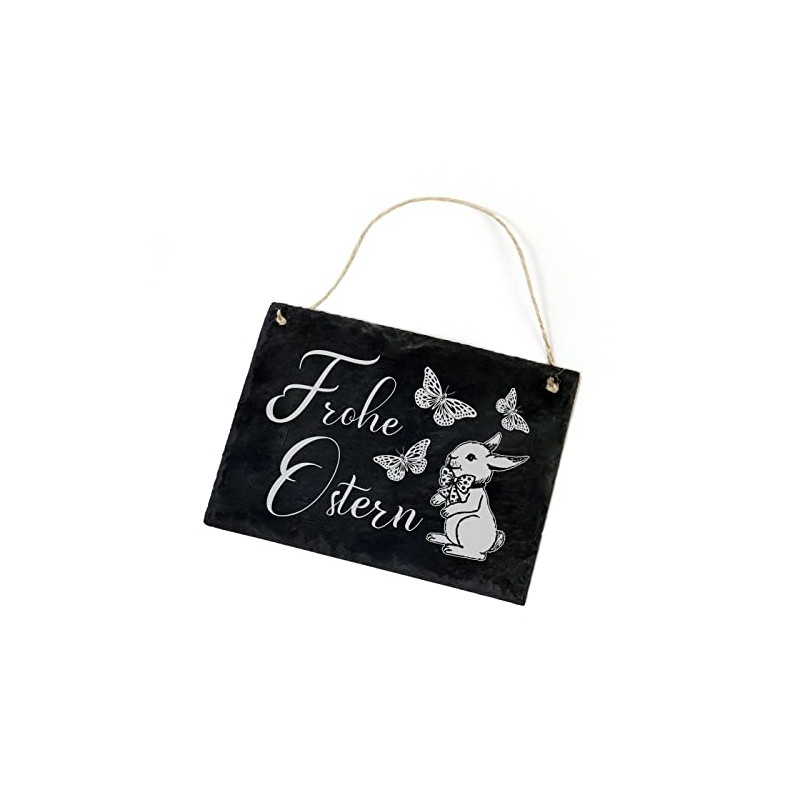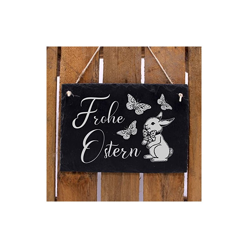 - You will receive a decorative plaque made of slate with pictured engraving: Frohe Ostern, Easter bunny with butterflies.