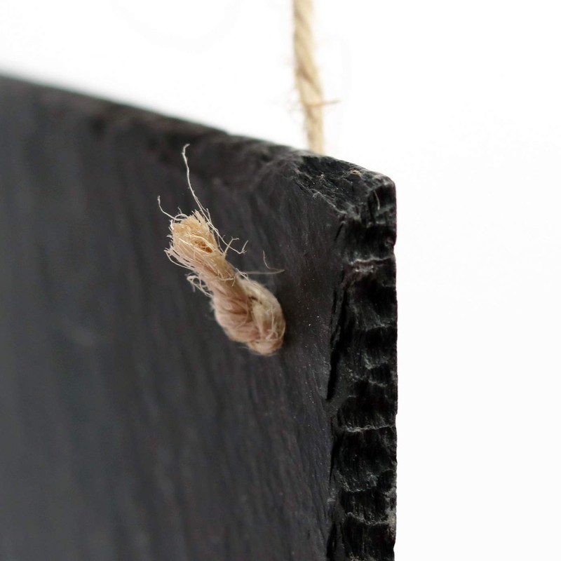 With the 2 holes in the top area and the rustic jute ribbon hanger, the slate can be attached to doors, walls and gates without any problems.
