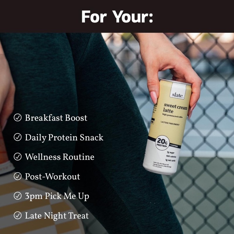 Slate Milk - High Protein Iced Coffee - Sweet Cream Latte - 175mg Caffeine, Lactose Free Energy - 20g Protein, 1g Sugar, 100 Calories, 1g Net Carbs, No Sugar Added - Protein Coffee - 11 fl oz, 24 Cans