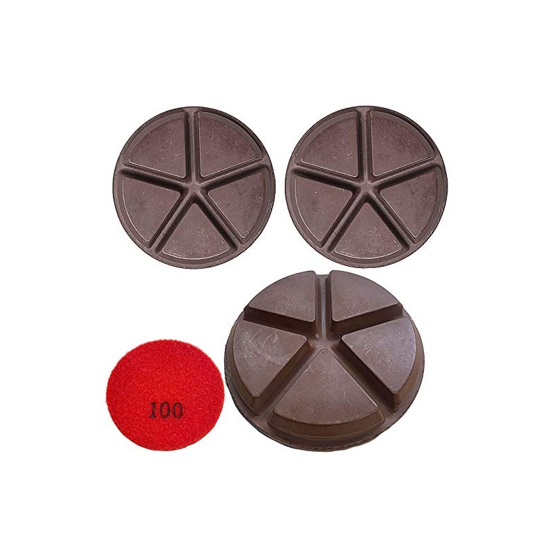 This 3" Slayer Ceramic bond diamond floor disc is from the set for polishing concrete slabs. This is the 100 grit pad which is used on floor machines and auto-scrubbers for beginning the polishing process. These have a very long life and while they do not last forever, it is close :). Used in series from 30 through 400 grit they will bring the floor to a low gloss finish. If a higher gloss is desired you can then use resin discs and/or polishing compound to get the stone to pop..