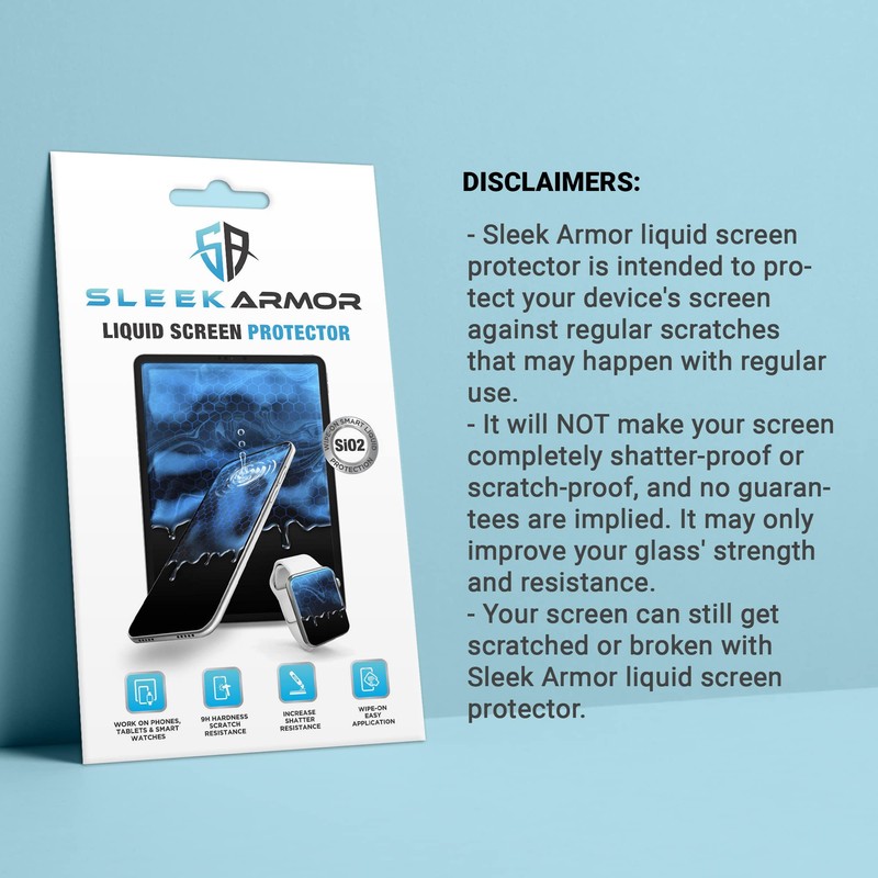 SLEEK ARMOR Liquid Screen Protection was formulated in Germany utilizing cutting-edge Nano SiO2 technology to coat and protect all types of mobile device screens seamlessly. Silica Dioxide (SiO2) is mainly nanoparticles of glass suspended in a transparent liquid coating. Once applied, SLEEK ARMOR creates a seamless, invisible protective layer of liquid glass that bonds to any glass device screen at a microscopic level. The results are significant; with an increase of the screen hardness to 9H, SLEEK ARMOR will help reduce screen surface scratches and screen breaks due to accidental drops. Liquid screen protector is intended to protect your device's screen against regular scratches that may happen with regular use. It will NOT make your screen completely shatter-proof or scratch-proof. It will only improve your glass' strength and increase the scratch resistance. Your screen can still get scratched or broken with a liquid glass screen protector.