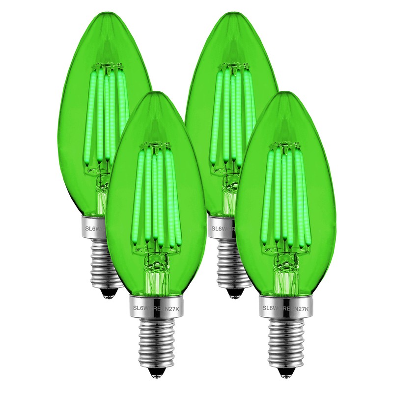 SleekLighting 5 Watt E12 LED Filament Candelabra Green Light Bulb, (60W Incandescent Replacement) Chandelier Torpedo Tip, Clear Glass Cover E12 Base 4 Pack