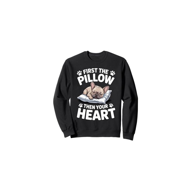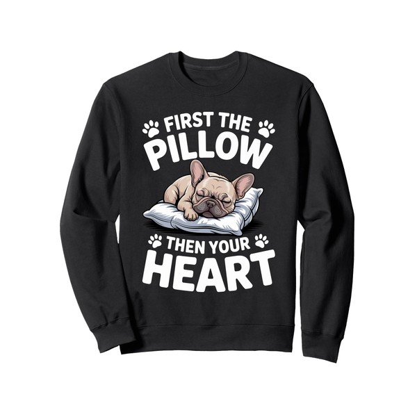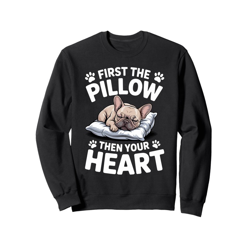 - This Cute sleeping French Bulldog Frenchie Dog graphic is perfect for everyone who loves cute and cozy sleepwear. The "First the pillow then your heart" Design is perfect for Frenchie Lover.