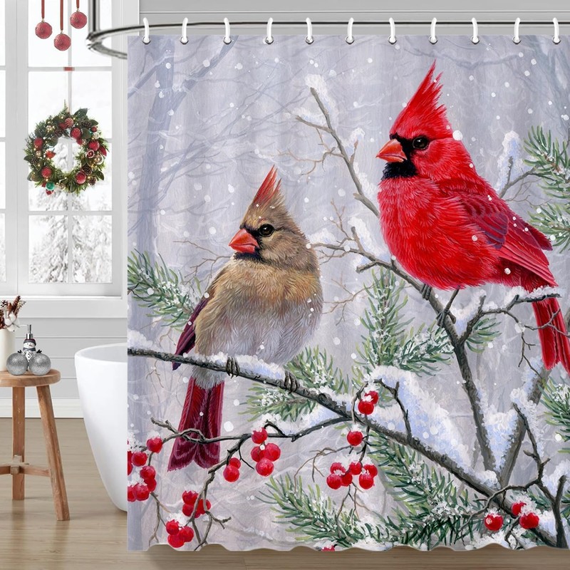 SLEEPBED Merry Christmas Shower Curtains for Bathroom, Waterproof Winter Robin Red Cardinal Bird Shower Curtain Set with 12 Hooks, 72x72