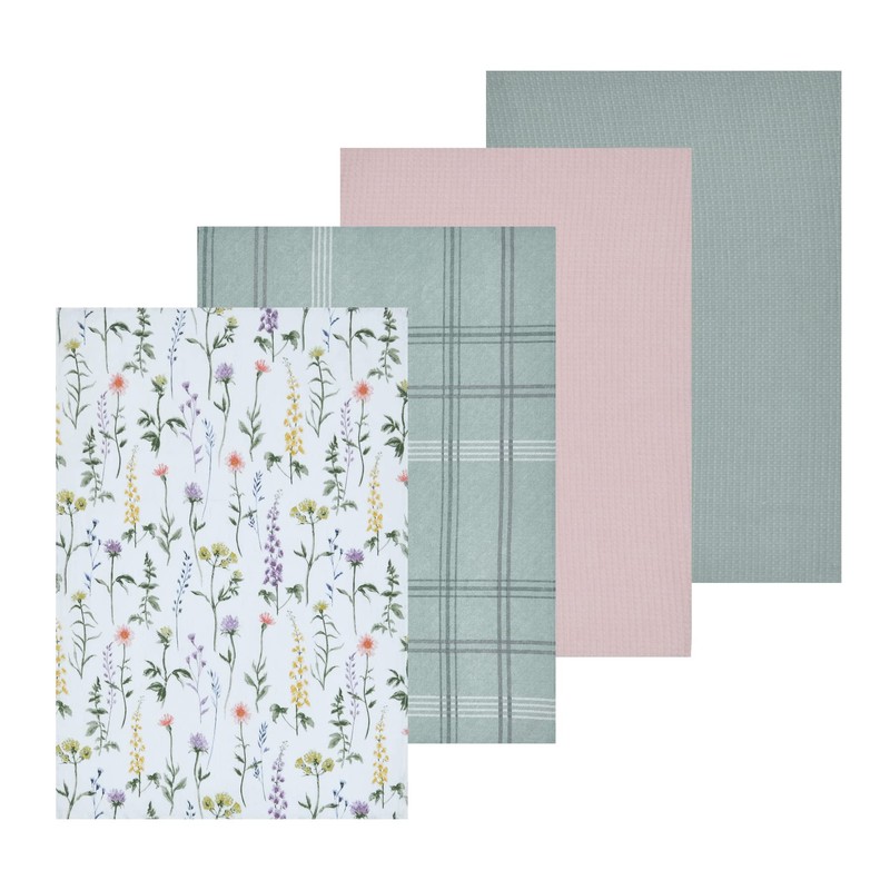 Sleepdown Meadow Floral Printed & Waffle Tea Towels 100% Cotton Half Panama - Super Absorbent Luxury Hotel Quality Kitchen Towel - Pack of 4 - White - 46cm x 65cm