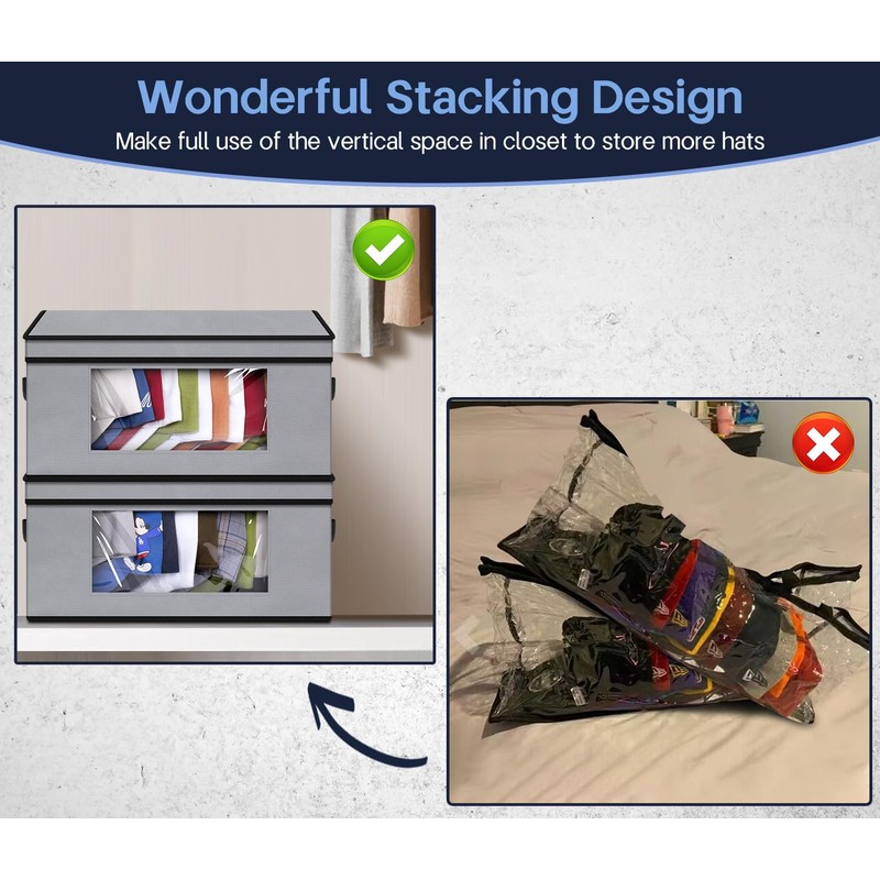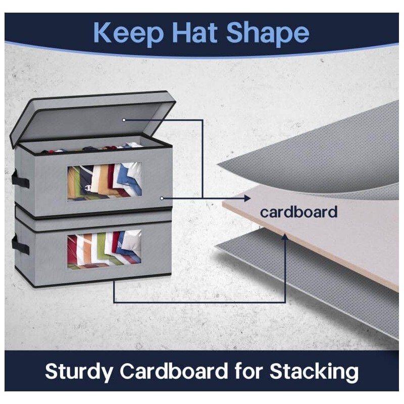 • The hat storage for baseball caps come with study hard cardboard on the lid, bottom and all sides so that you can stack them together in closet shelves. Hat holder could protect your caps from dust and ensuring your hats remain in pristine condition;